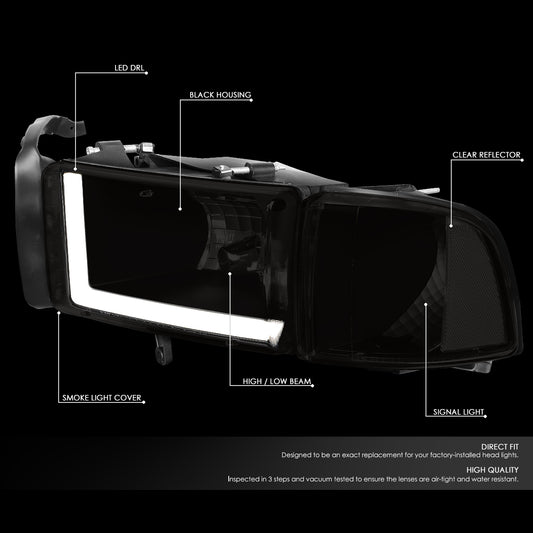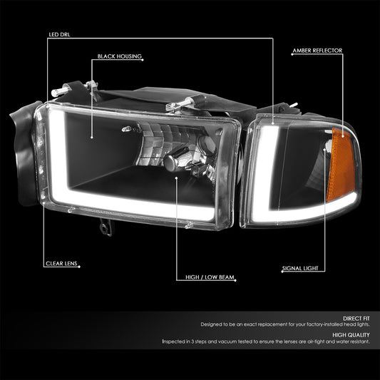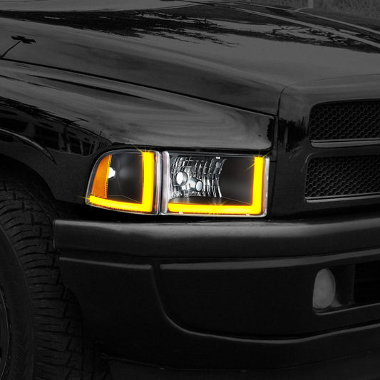 94-02 Dodge Ram 1500-3500 Headlights Black/Amber Switchback Dual L-LED DRL