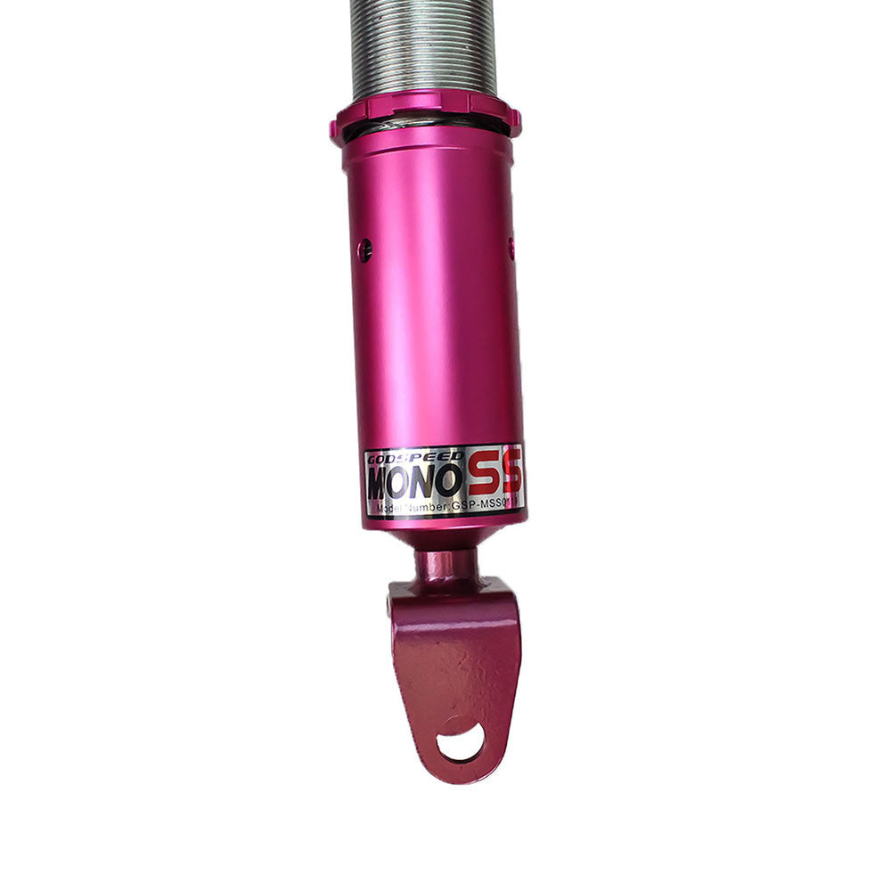 Godspeed Project's MonoSS is our one entity in our family of single-adjustable coilover suspension kits. These coilovers are designed to be a streetable race built coilover at an affordable price. It features a monotube damper that is made out of a carbon seamless steel 52mm tube with a performance internal piston providing maximum damper response. The cold-bent springs are made from high strength SAE9252 steel to optimize the balance between performance and comfort. Using race quality shock oil, Godspeed Project can guarantee exceptional damper performance at any temperature on and off the track. The top of the shock is attached to the car using a high quality top hat that features a high performance Japanese KOYO 6204Z bearing pillow ball mount (when applicable). The bottom shock brackets are made out of a T7075 forged aluminum or carbon steel brackets for lighter weight without sacrificing durability which also includes brake line brackets (when applicable). The MonoSS offers 16 level of damper adjustability which can be set to your preference.