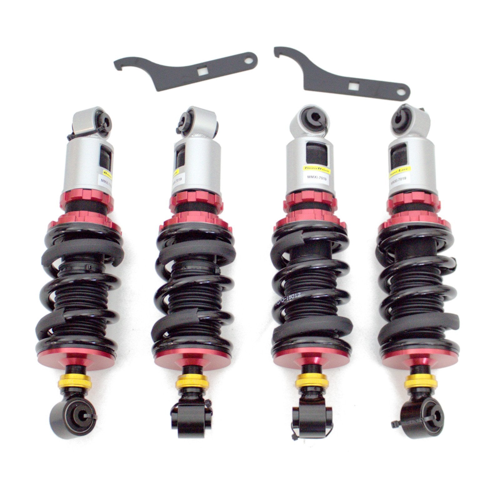 Godspeed Project's MAXX Sports line is engineered to be a more track-oriented coil-over system. Utilized "Inverted" mono-tube shocks to replace where MacPherson struts are used for better rigidity. All mono-tube shocks are finished with anti-corrosion coating and special valving that allows 20-level adjustments to control the rebound damping force. Pillow ball top mounts on four corners provide a far more precise feel from the suspension and steering. High-rigidity steel coil springs provide more control and quick steering to improve the vehicle's overall handling. Aluminum hardware is used where applicable to reduce overall weight.
