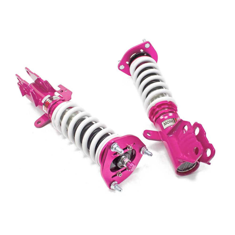 Godspeed Project's MonoSS is our one entity in our family of single-adjustable coilover suspension kits. These coilovers are designed to be a streetable race built coilover at an affordable price. It features a monotube damper that is made out of a carbon seamless steel 52mm tube with a performance internal piston providing maximum damper response. The cold-bent springs are made from high strength SAE9252 steel to optimize the balance between performance and comfort. Using race quality shock oil, Godspeed Project can guarantee exceptional damper performance at any temperature on and off the track. The top of the shock is attached to the car using a high quality top hat that features a high performance Japanese KOYO 6204Z bearing pillow ball mount (when applicable). The bottom shock brackets are made out of a T7075 forged aluminum or carbon steel brackets for lighter weight without sacrificing durability which also includes brake line brackets (when applicable). The MonoSS offers 16 level of damper adjustability which can be set to your preference.
