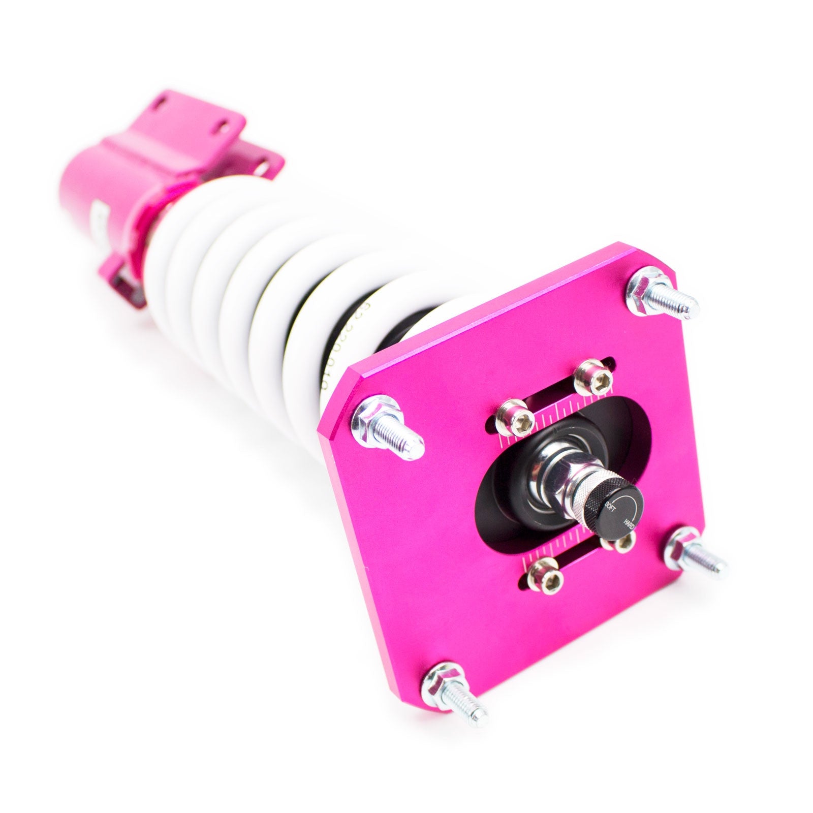Godspeed Project's MonoSS is our entry level performance adjustable coilover suspension kits. These coilovers are designed to be a streetable race built coilover at an affordable price. It features larger 52mm stainless steel monotube shock with 16 levels Damping adjustability with a performance internal piston providing maximum damper response. Paired With cold-wound springs made from high strength SAE9252 steel to optimize the balance between performance and comfort. Using race quality shock oil, You can expect exceptional damper performance at any temperature on and off the track. The top of the shock is attached to the car using a high quality top hat that features a high performance Japanese KOYO 6204Z bearing pillow ball mount (when applicable). The bottom shock brackets are made out of a T7075 forged aluminum or carbon steel brackets for lighter weight without sacrificing durability which also includes brake line brackets (when applicable). With MonoSS coilovers, you can assure to experience daily driven comfort with track performance.