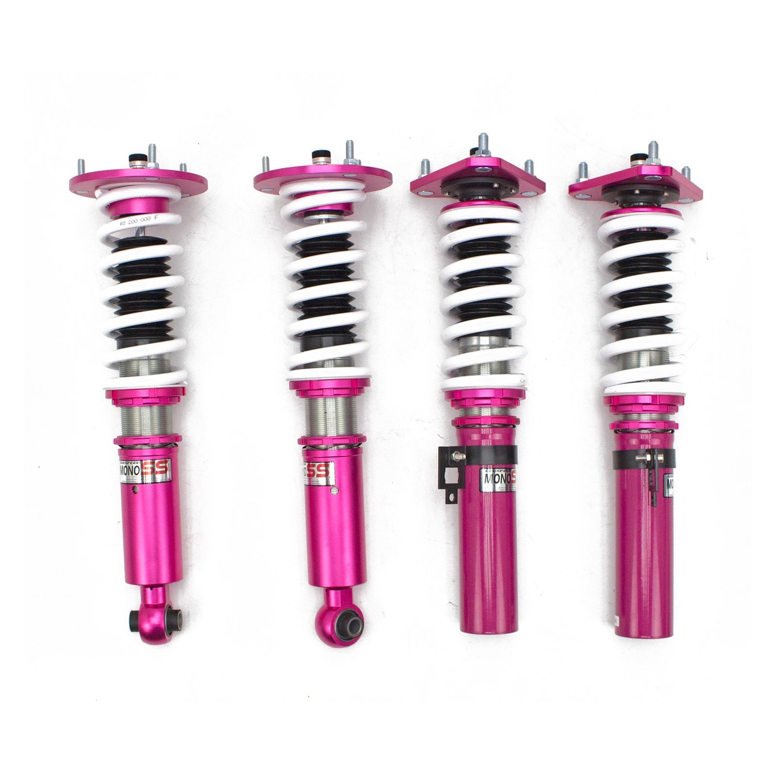 Godspeed Project's MonoSS is our one entity in our family of single-adjustable coilover suspension kits. These coilovers are designed to be a streetable race built coilover at an affordable price. It features a monotube damper that is made out of a carbon seamless steel 52mm tube with a performance internal piston providing maximum damper response. The cold-bent springs are made from high strength SAE9252 steel to optimize the balance between performance and comfort. Using race quality shock oil, Godspeed Project can guarantee exceptional damper performance at any temperature on and off the track. The top of the shock is attached to the car using a high quality top hat that features a high performance Japanese KOYO 6204Z bearing pillow ball mount (when applicable). The bottom shock brackets are made out of a T7075 forged aluminum or carbon steel brackets for lighter weight without sacrificing durability which also includes brake line brackets (when applicable). The MonoSS offers 16 level of damper adjust ability which can be set to your preference.