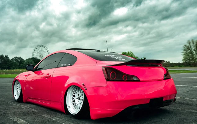 Deep lip design with chrome rivets and a bold gloss white finish for an aggressive, track-inspired stance.